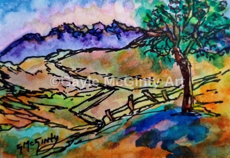 Shade Tree Hillside, watercolor and black ink, ACEO painting: