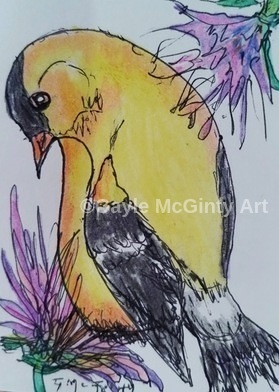 The American Goldfinch and tansy asters are painted using black ink and colored pencil.